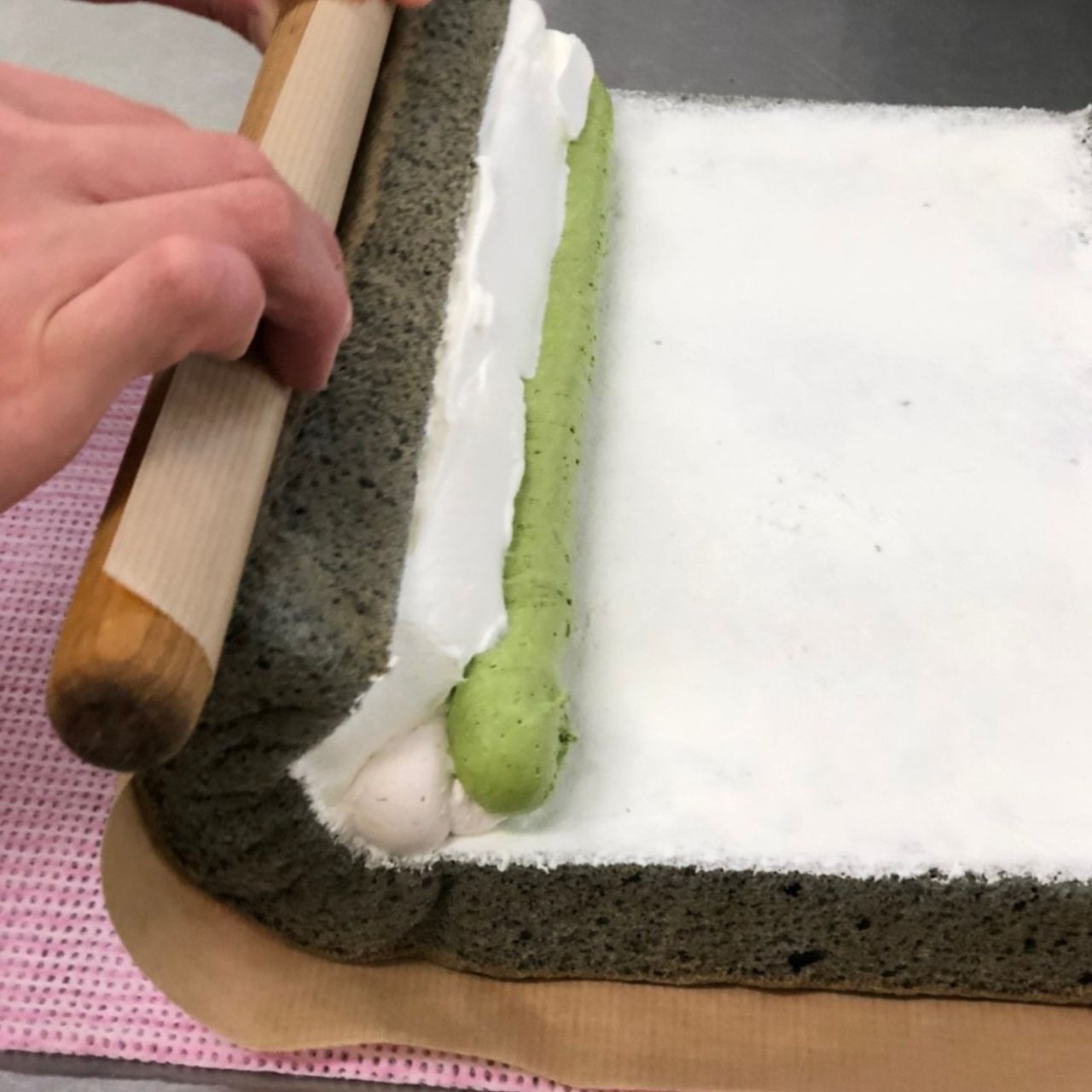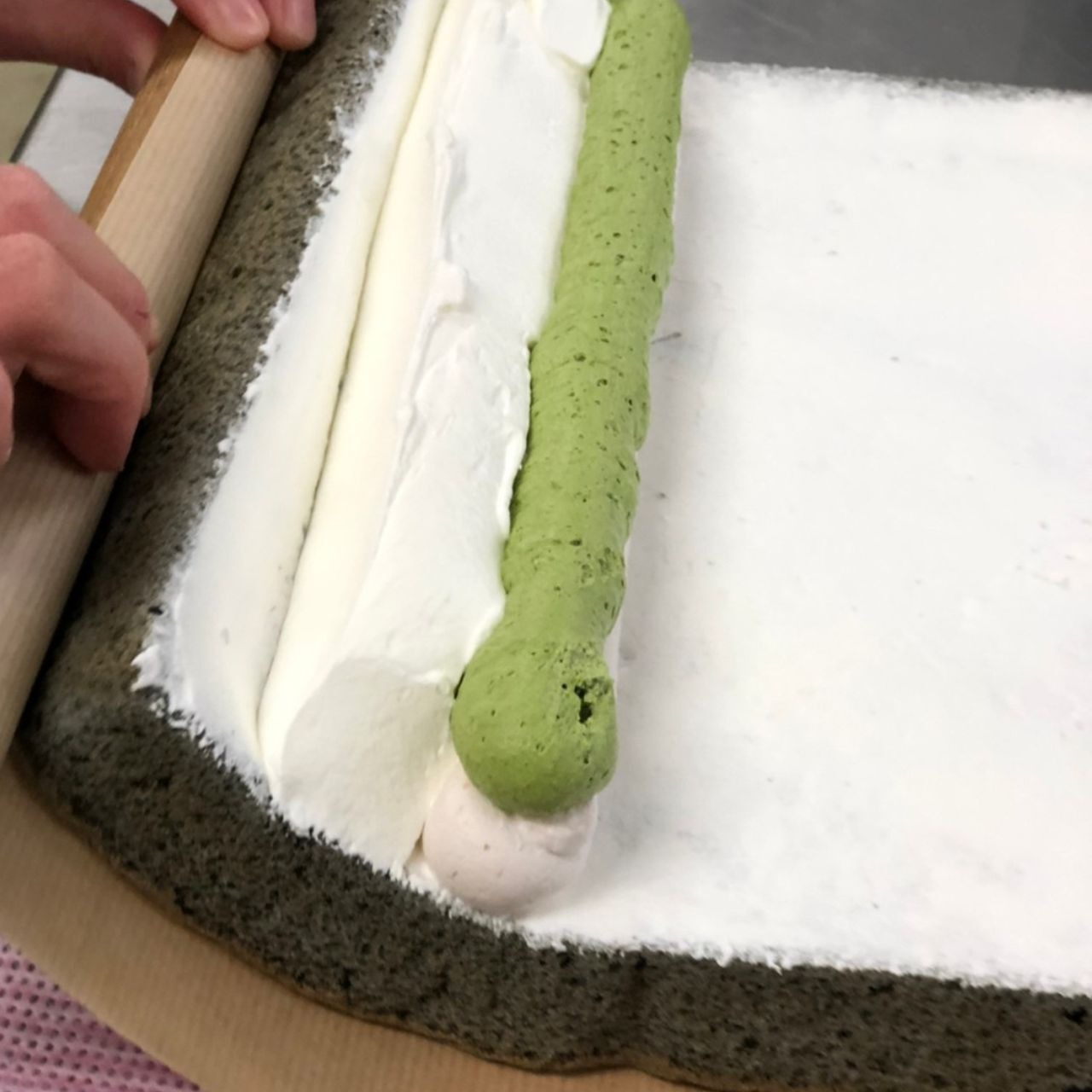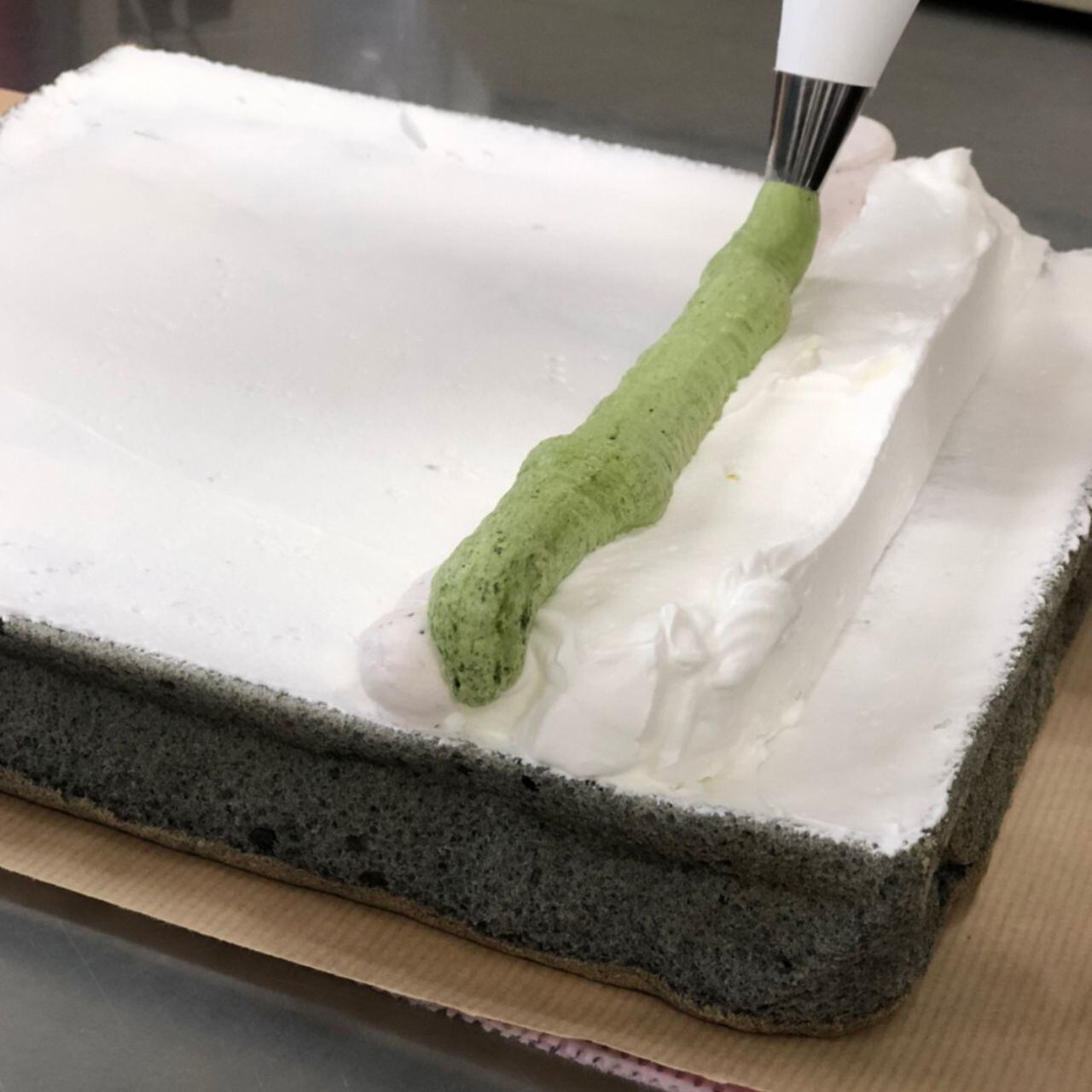 スポンジには池姫竹炭組合の竹炭パウダーを混ぜ込みました。舞鶴産のいちごと抹茶、そして生クリームの3色にして、彩り豊かに仕上げました。