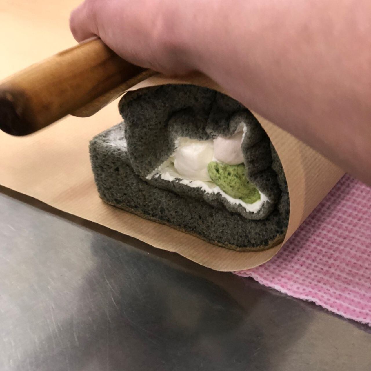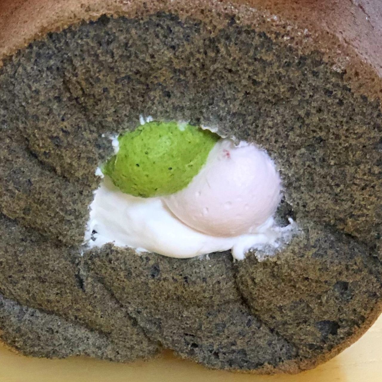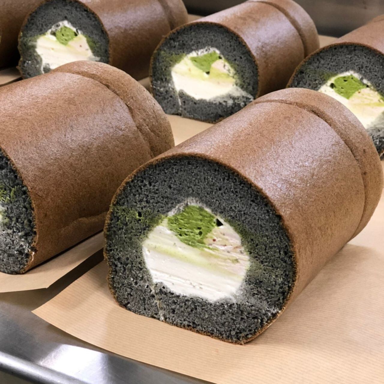 【原材料名】卵(舞鶴産)、ホイップクリーム、砂糖、小麦粉、牛乳、竹炭パウダー、いちごジャム、抹茶パウダー